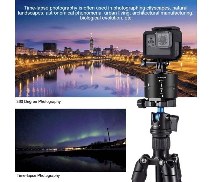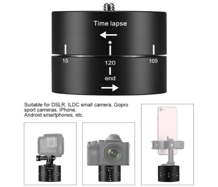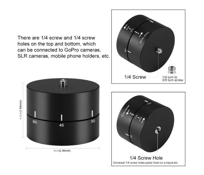 Pořizujete rádi Time-Lapse záběry? Tak to bude tahle vychytávka pro vás to pravé. Na adaptér nasadíte vaší akční kameru a při otočení adaptéru o 360° se vrátí adaptér do výchozí pozice za 120 minut, při otočení o 270° za 90 minut, při otočení o 180° za 60 minut a při otočení o 90° za 30 minut. Maximální zatížení adaptéru je 500g.