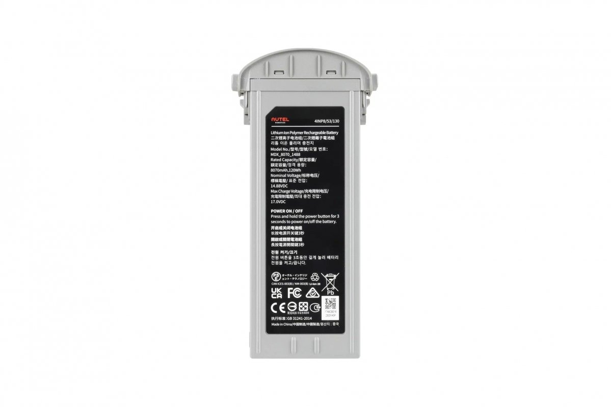 Inteligentní baterie Autel EVO Max poskytuje vysokou kapacitu 8070 mAh a 120 Wh, což zajišťuje výdrž až 42 minut na jedno nabití pro vaše letecké mise. S nominálním napětím 14.88 VDC a maximálním nabíjecím napětím 17.0 VDC umožňuje efektivní a rychlé nabíjení, minimalizující dobu přerušení provozu. Tato baterie je navržena pro maximální výkon a spolehlivost.