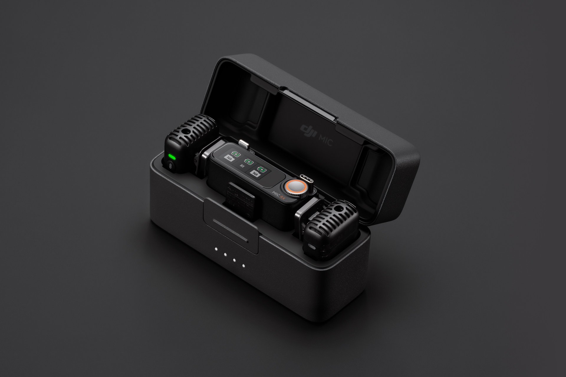 Nabíjecí pouzdro DJI Mic 2 nabízí možnost dobíjení dvou vysílačů a jednoho přijímače, čímž zajišťuje až 18 hodin provozní doby pro neomezené tvoření. Pouzdro poskytuje úložný prostor nejen pro vysílače a přijímač, ale také pro mobilní adaptéry (USB-C a Lightning), což usnadňuje přenášení. Automatické propojení přijímače a vysílačů po otevření pouzdra umožňuje okamžité použití. Součástí balení je navíc i přepravní pouzdro.