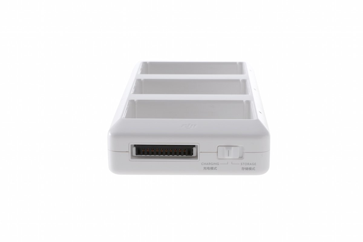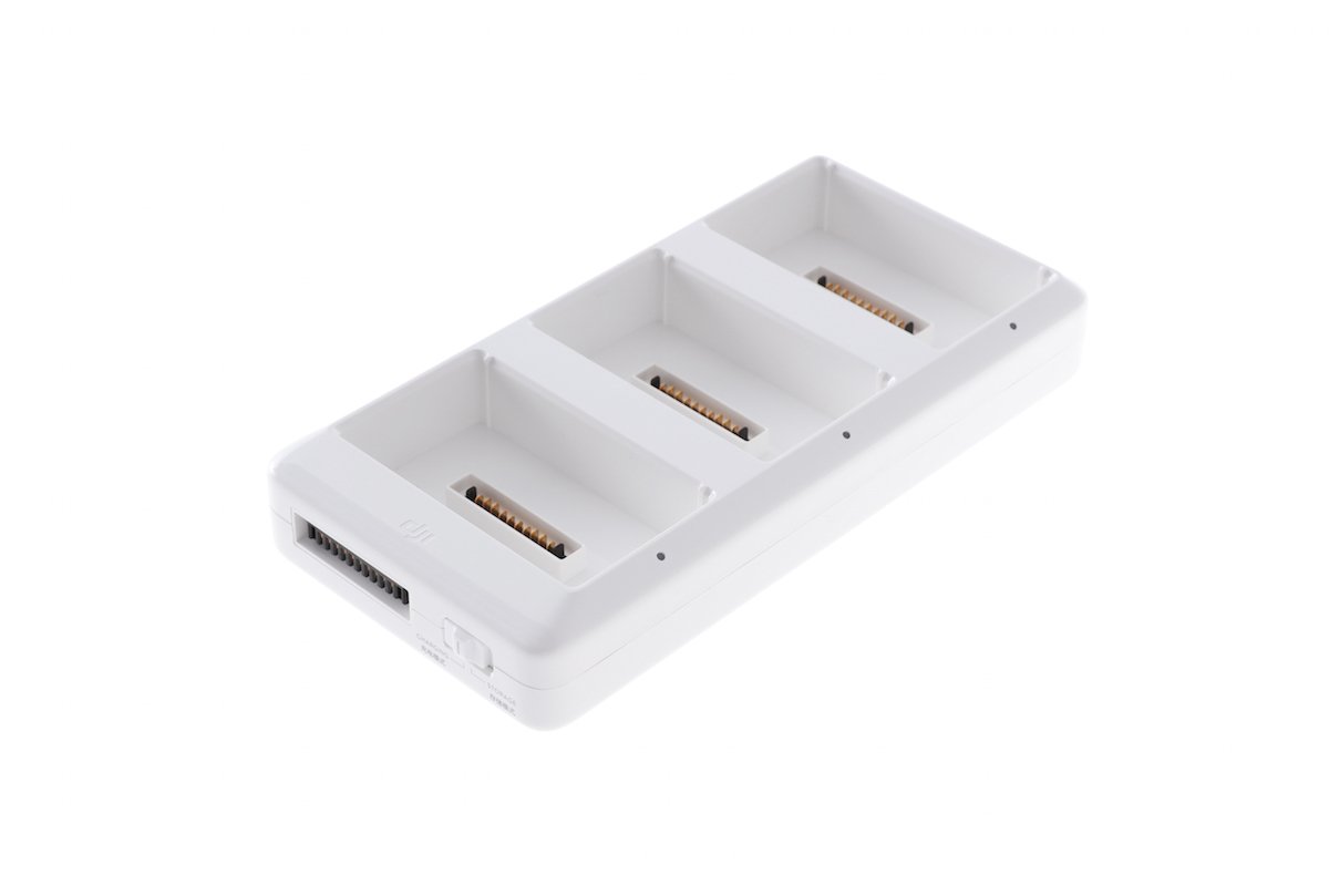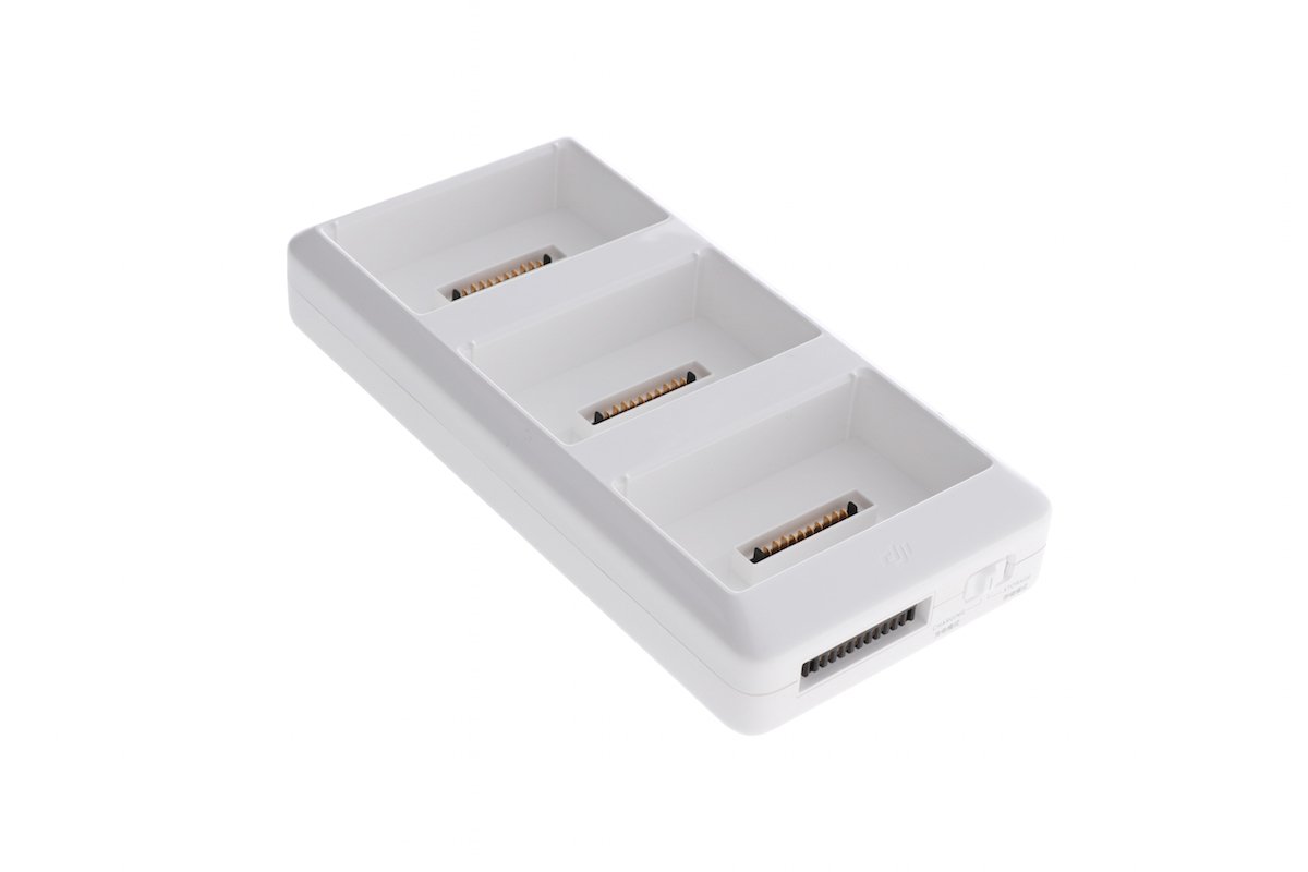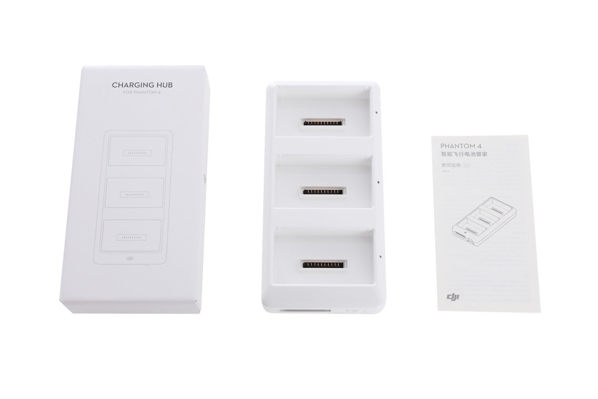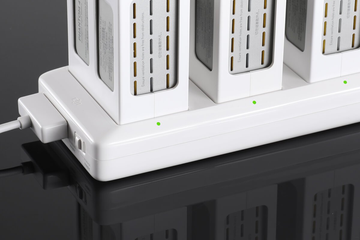 Při použití nabíjecí stanice s nabíječkou Phantom 4 umožňuje nabíjení až 3 inteligentních baterií zároveň. Baterie se nabíjí v sestupném pořadí – od jednotky s nejvyšší zbývající kapacitou po nejnižší. Adaptér disponuje ochranným systémem pro uskladnění, při němž je kapacita baterií udržována na 50%.
