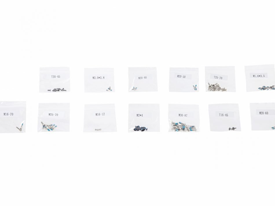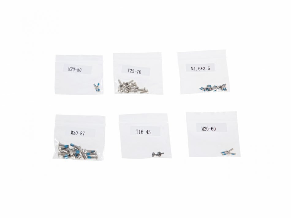 Sada obsahuje všechny šrouby potřebné k montáži jednotlivých komponentů dronu DJI Phantom 4. Sety šroubů jsou balené zvlášť podle typu a místa určení, pro větší přehlednost jsou jednotlivá balení číselně označena. Příslušenství je originálním produktem firmy světového leadra na poli bezpilotních systémů DJI.