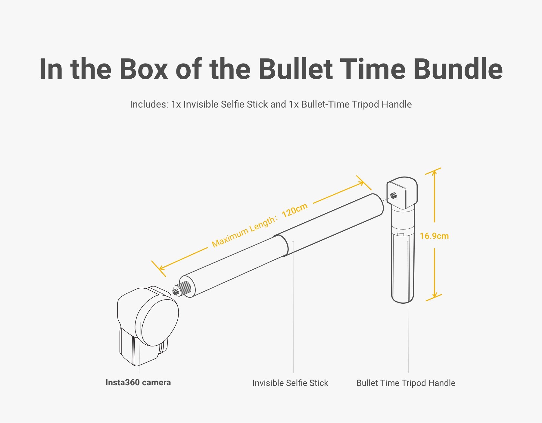 Balíček pro vytváření záběrů Bullet Time obsahuje selfie tyč a rukojeť se stativem. Záběr Bullet Time vytvoříte připevněním kamery na selfie tyč, ke které připojíte rukojeť a otáčením kolem své osy vytvoříte zcela originální záběry. Vždy se při instalaci ujistěte zda je tyč správně připevněna ke kameře.