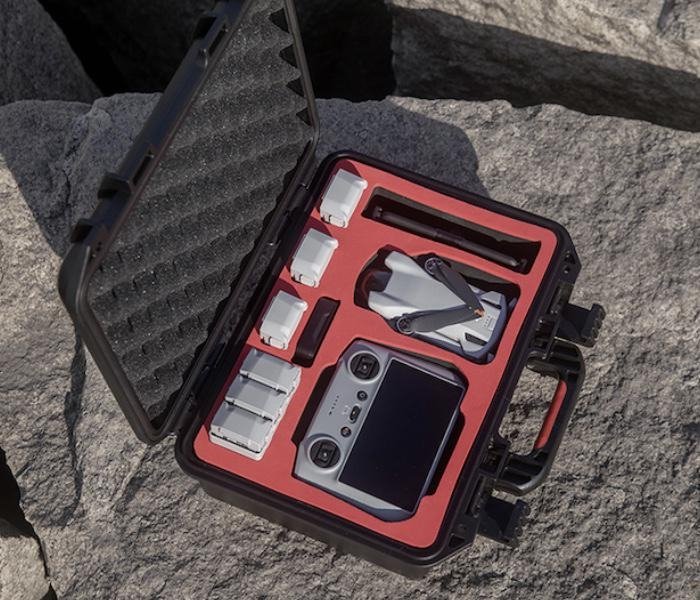 Voděodolný kufr značky Pgytech je kompatibilní s dronem DJI Mini 3 (není kompatibilní s DJI Mini 3 Pro). Kufr je uvnitř uzpůsoben buď na klasický dálkový ovladač k dronu nebo na DJI RC. Vnitřek kufru je vybaven pěnovou výplní a uložíte do něj dron, ovladač, tři baterie, náhradní vrtule, nabíječku i s nabíjecí stanicí, filtry a další.