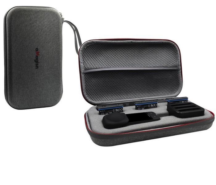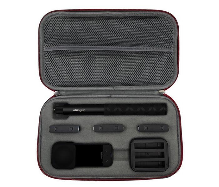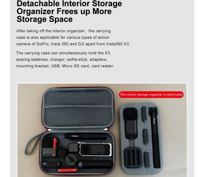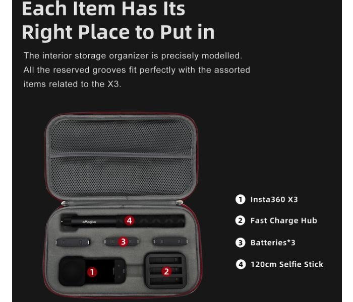 Šedé pouzdro je určené na akční kameru Insta360 X3. Pouzdro o rozměrech 29 × 16,5 × 5,5 cm je voděodolné a uložíte do něj kameru, neviditelnou selfie tyč, tři baterie, nabíjecí stanici a do kapsy pod víkem uložíte potřebné kabely, paměťové karty a další drobné nezbytnosti. Pěnová výplň uvnitř je vyjímatelná.