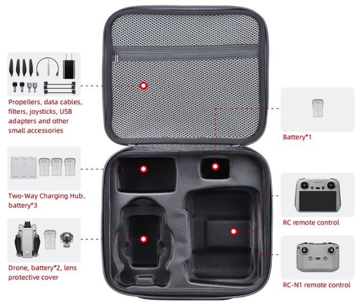 Šedé pouzdro s polstrováním je určeno na přepravu dronu DJI Mini 3 / Mini 3 Pro. Do pouzdra uložíte včetně dronu i dálkový ovladač nebo DJI RC, pět náhradních baterií s nabíjecí stanicí a do pouzdra pod víkem uložíte potřebné kabely, paměťové karty, filtry a další drobnosti. Pouzdro je vybaveno odepínatelným popruhem přes rameno.