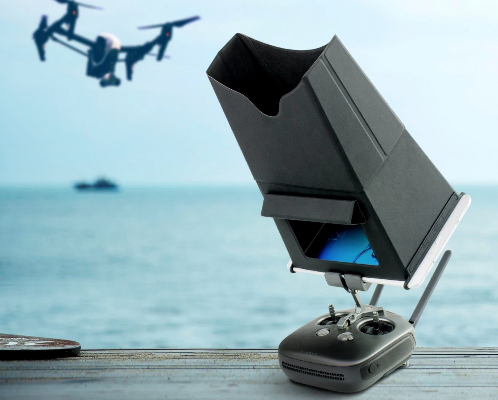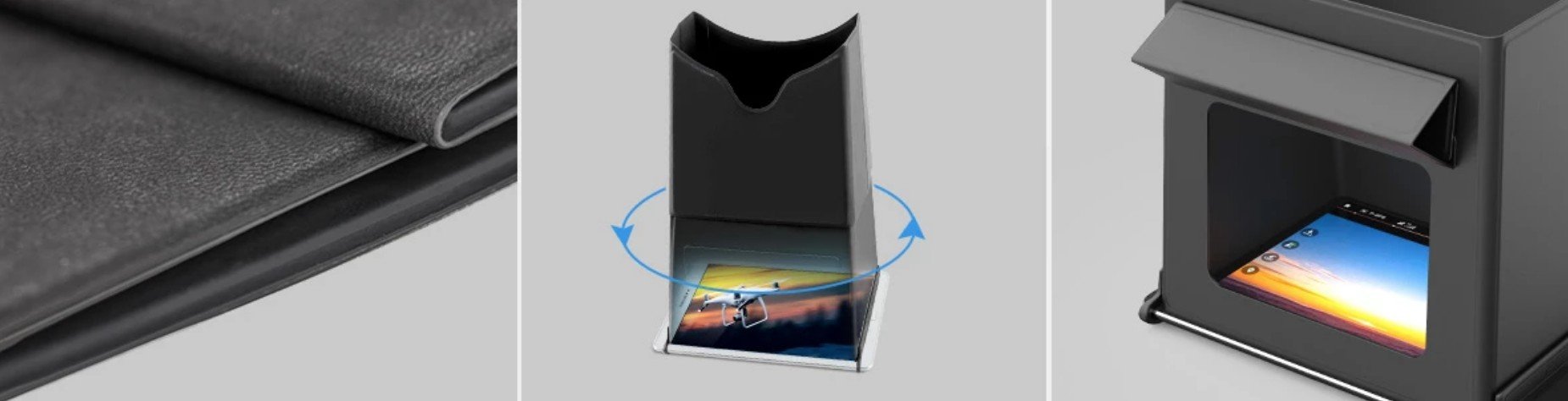 Sluneční clona pro tablety o velikosti až 7,9" je vhodná pro ovladače Phantom, Inspire a Matrice. Aplikace je snadná díky magnetickým stěnám, které k sobě jednoduše přilehnou. Clona je navíc vybavena okýnkem, které směřujte během instalace ke spodní hraně tabletu, abyste mohli využívat další funkce tabletu.